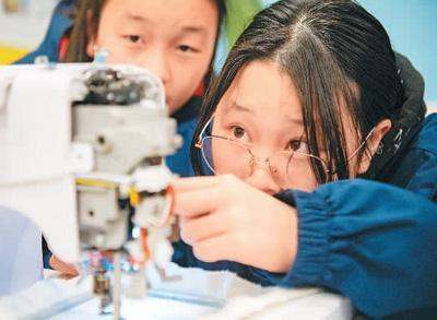 重庆市璧山中学学生在服装工作坊兴趣社团改造旧衣服。新华社记者 唐 奕