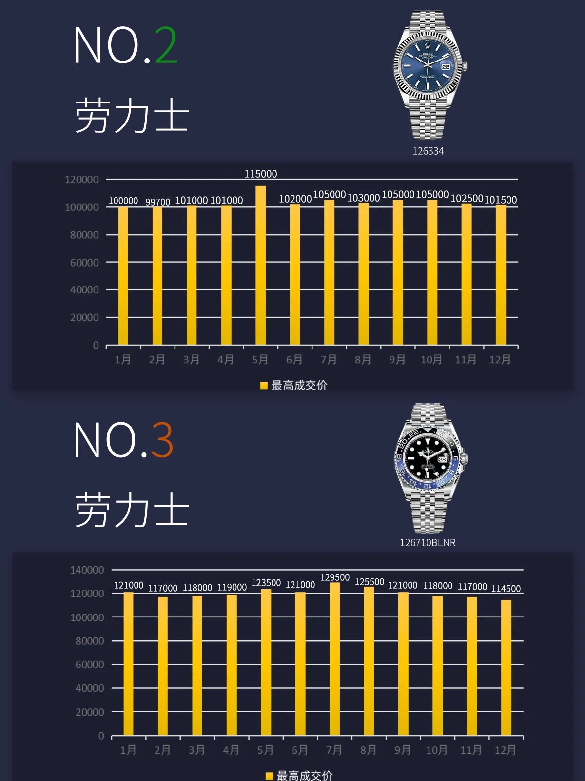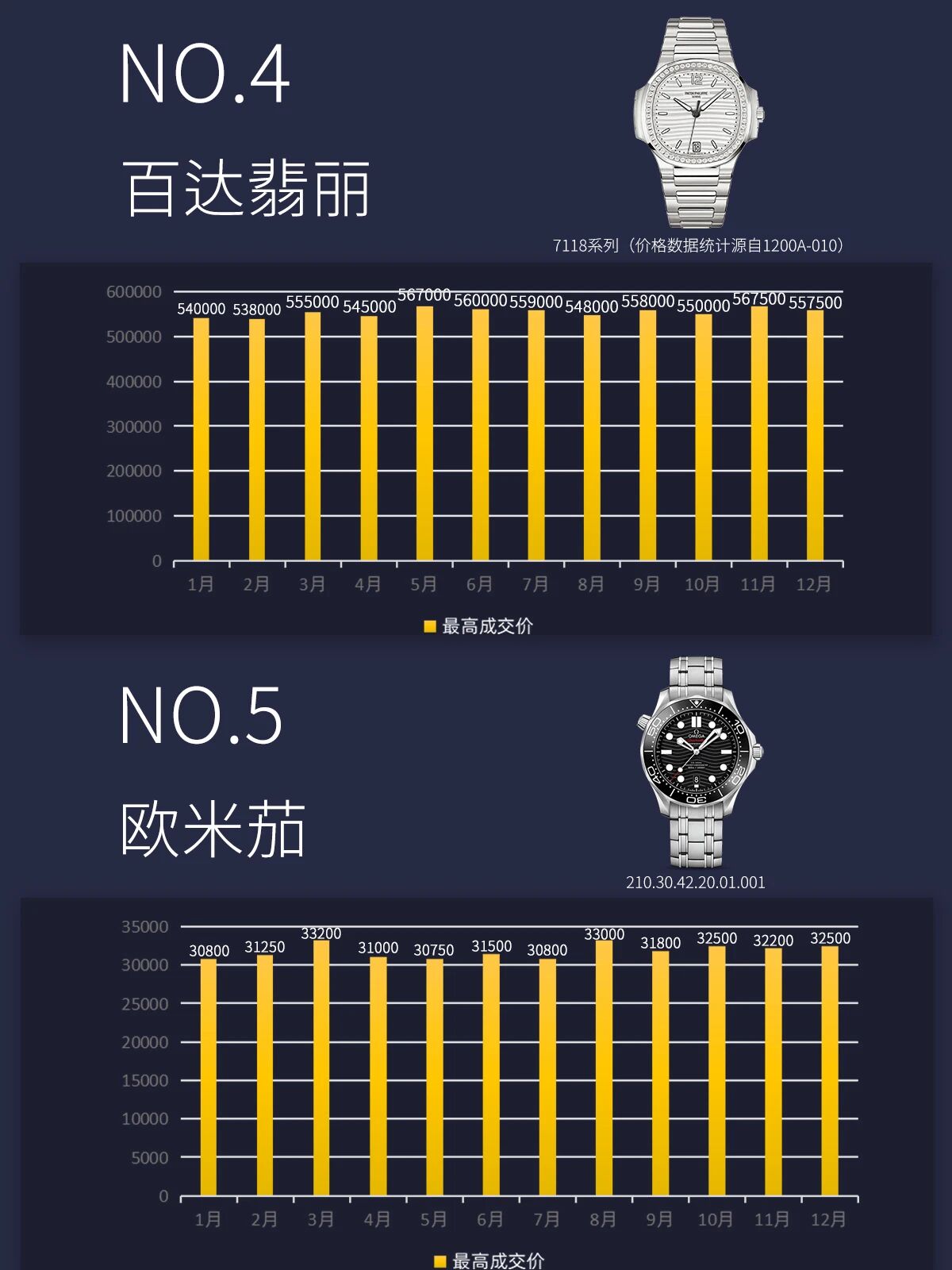 百达翡丽则延续其“表王”的地位,7118白钻钢款全年价格稳中有升,最高价达到56.75w,显示出贵价表强烈的市场需求。