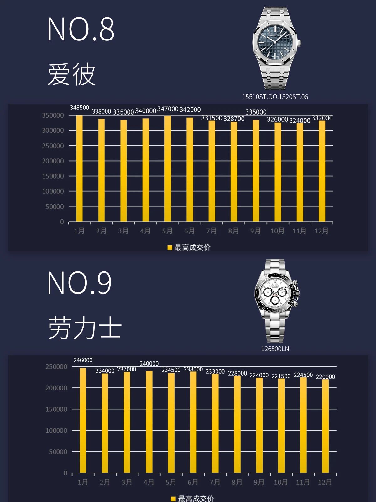 相比之下,欧米茄与爱彼的表现相对平稳。欧米茄海马300黑盘钢款全年价格波动较小,始终保持在3万元左右的区间;爱彼15510ST蓝盘虽略有下降,但全年价格仍在30万元以上,相信有一部分钟表爱好者是被尊达大师的经典设计所吸引。