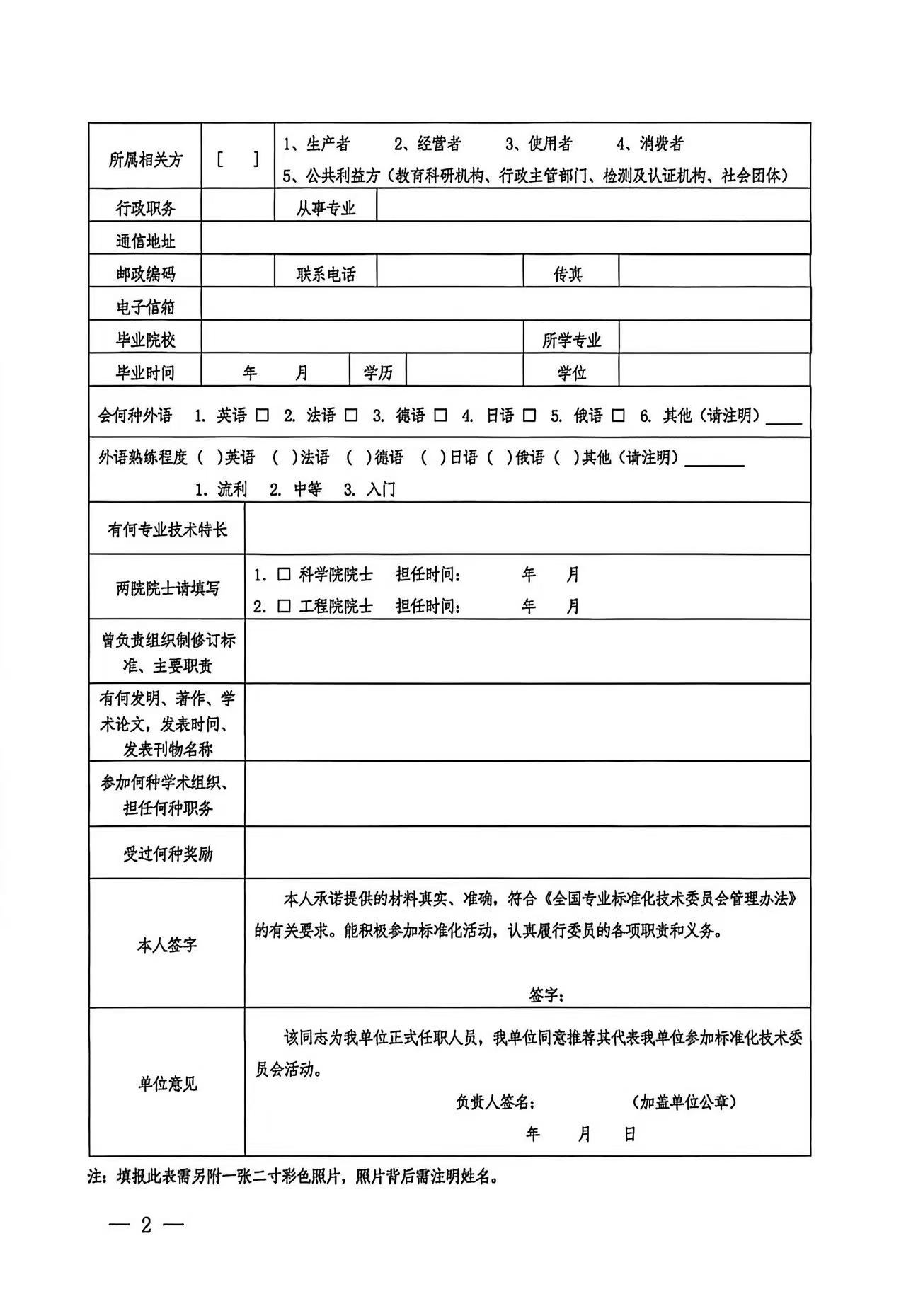 、全国专业标准化技术委员会委员登记表