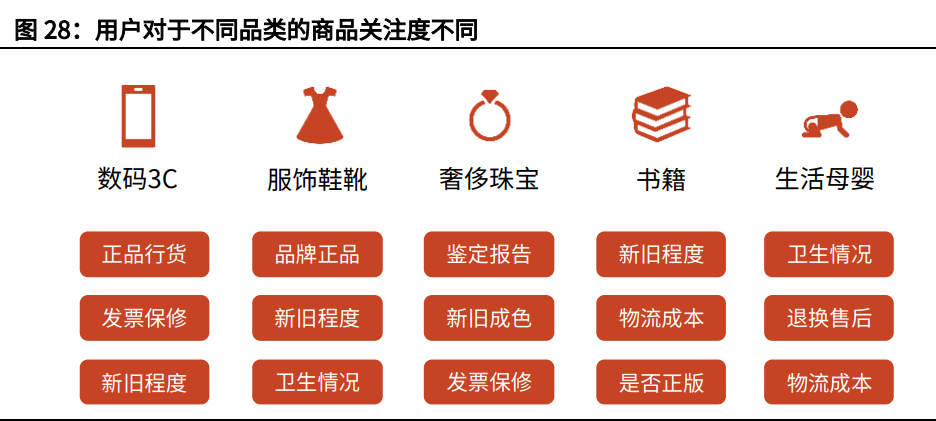 从产品端看,消费者对于不同品类商品的关注侧重点不同:1)二手 3C 产品: 绝大部分是非标品,品牌较为集中,单价普遍较高,用户更加关注商品是否是正 品行货、商品质量能否得到保障、有无发票及售后服务等问题;2)二手服饰: 二手平台转售的大多是大牌服饰,而且国内用户对于服饰洁癖度较高,能否保证 品牌正品、新旧程度及卫生情况是主要关注点;3)二手奢侈品:相较于其他品 类,奢侈珠宝多为中小型商品,客单价更高,二手买家更加关注产品是否有鉴定 报告、新旧成色及是否有发票可保修等;4)二手书籍:单价相对较低,商品的 物流成本、新旧程度是用户的主要关注点;5)生活母婴品:90 后父母更加注重产品品质,二手母婴产品的卫生情况、售后退换服务是关注重点。各平台需要针 对不同产品品类,针对用户关注重点优化平台服务。