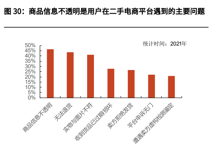 提升客户信任度是提高活跃用户数的前提。客户信任度提升能够培养用户的粘性 及复购率,同时提升平台形象,通过口碑效应引流。据艾媒咨询 2021 年统计, 因为假货太多、不信任平台而拒绝使用二手电商平台的网民占比 37.8%。用户 对于二手电商平台信任度较低的主要原因包括:1)商品信息不透明(占比 46.1%);2)无法退货(占比 43.3%);3)实物与图片不符(占比 41.1%)。 提高商品信息透明度及完善售后服务机制将是二手电商构建核心竞争力的关键。