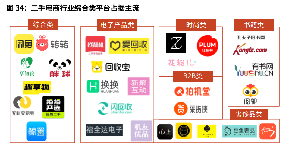 从产品角度看,综合类平台占据主流,交易品类基本涵盖所有消费品。二手电商 行业历经 10 多年的发展,目前呈现综合平台占主流,垂直平台圈地精耕的竞争 格局。从产品端看可以将二手电商划分为:1)二手综合类,如闲鱼、转转等; 2)二手电子产品类,如爱回收、回收宝等;3)二手时尚类,如只二、红布林 等;4)二手奢侈品类,如心上、胖虎等;5)二手书籍类,如孔夫子旧书网、 阅邻等。