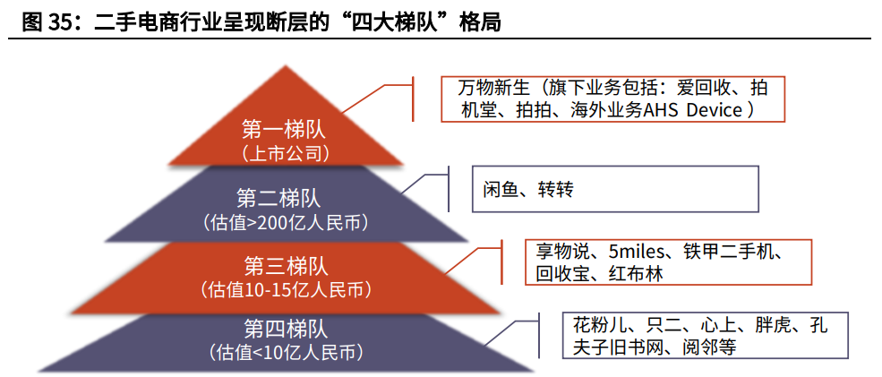 万物新生上市,二手电商形成“四大梯队”,二、三梯队断层严重。第一梯队: 万物新生整合爱回收、拍机堂、拍拍及海外业务 AHS Device 后,于 2021 年 6月在纽交所上市,成为中国首家上市的二手 3C 电商。第二梯队:以闲鱼、转转 为代表的综合类平台为主。第三梯队:以享 物说、5miles、铁甲二手机、回收宝、红布林为代表的垂类平台为主;第四梯队:以经营二手书 籍、二手奢侈品等交易品类的平台为主,包括孔夫子旧书网、花粉儿、只二等。