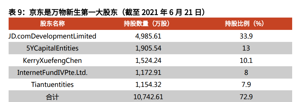 公司经多轮融资,京东集团成为第一大股东。公司成立至今先后获五源资本、京 东、景林投资、TigerGlobalManagement 等多轮投资,融资金额超 14 亿美元。 从 2015 年 8 月 C 轮融资开始,京东通过参与多轮投资,成为第一大股东和第一 大机构股东,合计持股 4985.6 万股,股权占比 33.9%。此外,万物新生大股东 还有五源资本(持股 1905.5 万股,占比 13%)、公司创始人兼 CEO 陈雪峰(持 股 1524.2 万股,占比 10.1%)、InternetFundIVPte.Ltd.(持股 1172.9 万股, 占比 8%)和天图资本(持股 1154.3 万股,占比 7.9%)。
