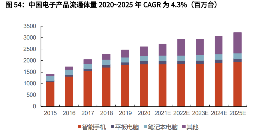 从交易额看,2020 年中国二手消费电子交易额(GMV 口径)达 2,522 亿元,其中智能手机品类约为 1,800 亿元,同比增长 27.66%; 据 CIC,预计 2025 年市场交易总额将达 9,673 亿元,其中智能手机品类为 6,900 亿元,2020~2025 年 CAGR 分别为 30.8%/30.9%。