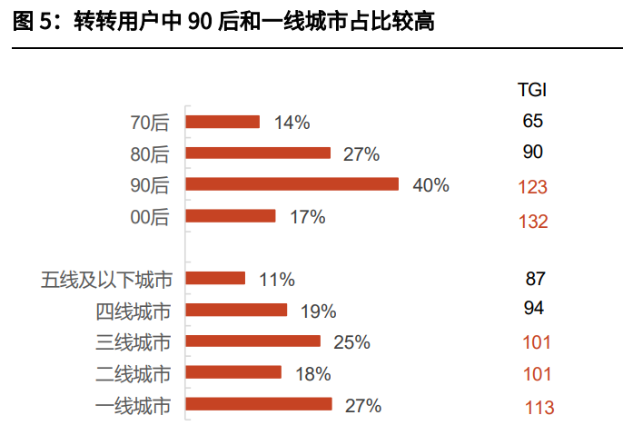 消 费 群 体呈 现 年 轻 化 趋 势 ,一线 城 市 用 户 占 比 较 大 。 从 年 龄 角 度 看 :据 QuestMobile 统计数据,2021 年 5 月,二手电商平台——闲鱼和转转的交易用 户中90后占比均在40%左右,显著高于其他年龄层。00 后用户虽占比不到20%, 但对于二手闲置交易平台的关注度(TGI)均超过 130,(TGI 高于 100 即代表 对某类问题的关注程度高于整体水平)高于其他年龄层。说明年轻人对于二手交 易的接受度更高,随 00 后用户购买能力不断增强,或将为二手电商平台提供用 户新增量。从城市分布角度看,闲鱼和转转的一线城市用户总占比分别为 30.8%/27.2%,高线城市用户对于二手电商更为关注,四线及以下城市的用户 TGI 均低于 100,下沉市场用户对二手电商关注度有待提升。