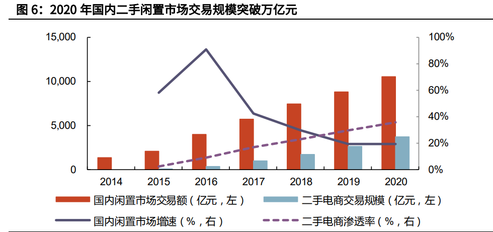 闲置经济崛起,为二手电商快速发展提供驱动力。闲置经济是指用户在二手市场 进行交易,置换闲置物品,延长商品在有限生命周期内的使用价值,从而将商品 使用效率发挥到最大的行为。2014~2020 年间,我国闲置市场规模从 1,328.2 亿元增长至 10,520 亿元,CAGR=41.2%,其中 2020 年同比增速为 19.1%。