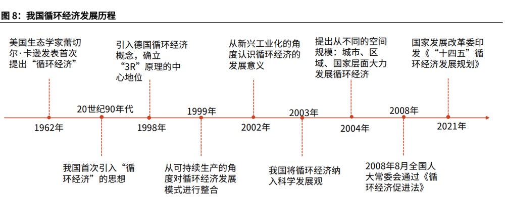 政策利好加快循环经济体系构建。循环经济,是指资源循环型经济,强调与环境 和谐,以资源节约和循环利用为特征,遵循“减量化、再利用、再循环”的“3R” 原则。其中:1)减量化属于输入端,旨在减少进入生产和消费流程的物质量; 2)再利用属于过程,旨在延长产品和服务的时间;3)再循环属于输出端,旨 在把废弃物再次资源化以减少最终处理量。20 世纪 90 年代之后,发展循环经济 成为国际社会的一大趋势,我国也提出发展“循环经济”,战略地位在 30 余年 发展中不断提高。