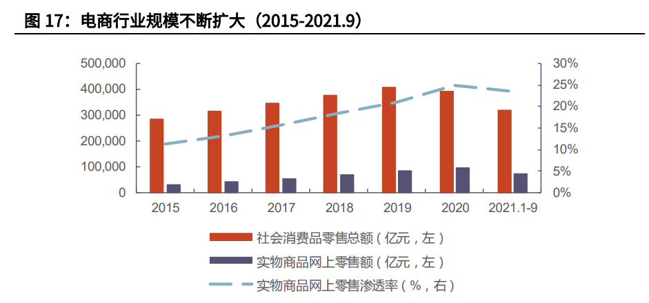 电商行业规模稳步扩大,大促活动频繁增加冲动非计划性消费。据国家统计局统 计,实物商品网上零售额 2016-2020 年复合增长率 CAGR 达 24.7%,渗透率从 13.3%提升至 24.9%,增加了 11.6pct。2021 年 1-9 月份,全国网上零售额 91,871 亿元,同比增长 18.5%。其中,实物商品网上零售额 75,042 亿元,同比增长 15.2%,占社会消费品零售总额的比重为 23.6%。电商行业规模稳步扩大,可为 二手交易供给端提供增量。