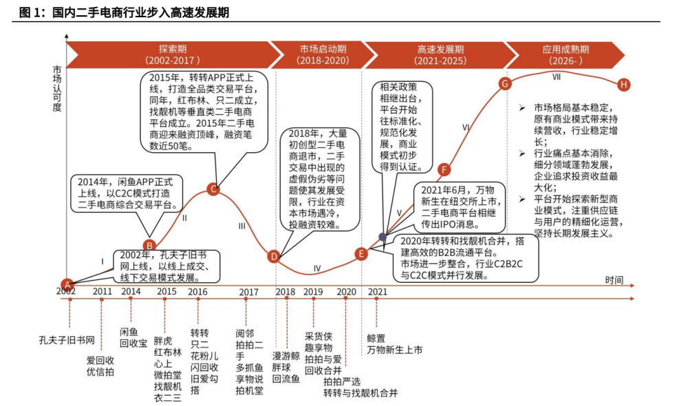 1)探索期(2002-2017):二手电商的诞生最初以线下二手交易寻求线上化发 展为契机,2002 年,中国首家二手电商网站 C2C 平台孔夫子旧书网成立,主要 用于二手书籍交易,标志着国内二手电商正式进入探索阶段。随后综合类交易平 台崛起,2014 年闲鱼成立、2016 年转转成功推出。同时,红布林(二手时尚奢 侈品,2015 年成立)、闪回收(二手电子产品,2016 年成立)、阅邻(二手书, 2017 年成立)等垂直类电商平台相继成立,中国二手市场逐步呈现百家争鸣的 局面。