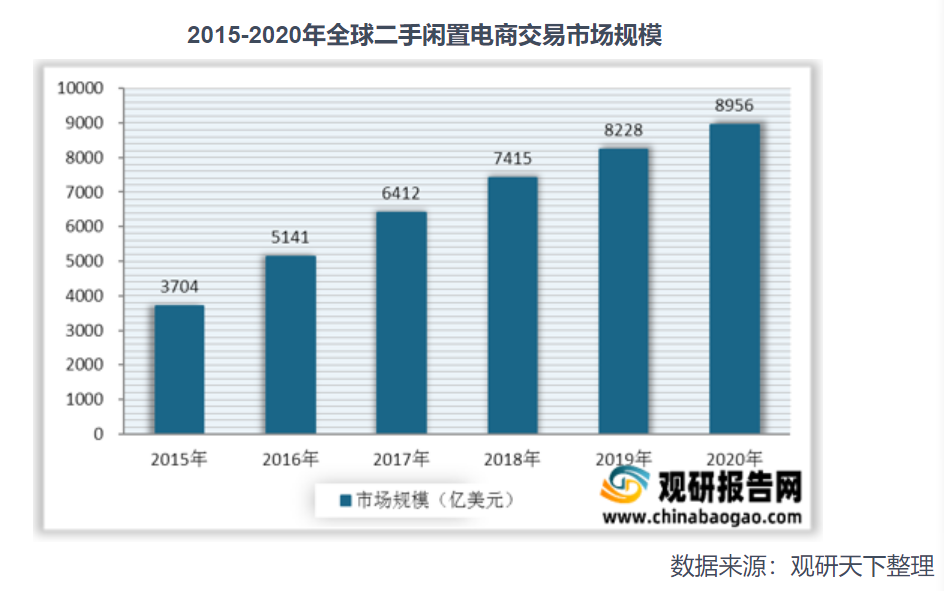 随着全球商品市场的不断丰富,各类产品更新迭代速度加快,环保型二手消费思想不断深入,全球二手闲置物品电商交易市场快速发展。统计数据显示,2019年全球二手闲置物品电商交易市场规模达到8228亿美元,2020年二手闲置物品电商交易市场规模增长至8956亿美元。