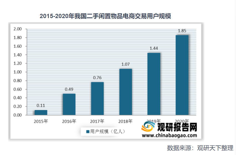 由于我国经济发展迅速,二手闲置物品交易的需求量越来越大,同时我国电商物流行业发展迅速,使我国二手闲置物品电商交易便利性极强,我国二手闲置物品电商行业用户数量快速增 长,统计数据显示,2017年我国二手电商交易用户数达到0.76亿人,2018年用户数已成功突破1亿大关,增长势头强劲。2020年我国二手电商交易用户规模增长至近两亿人,增速明显。