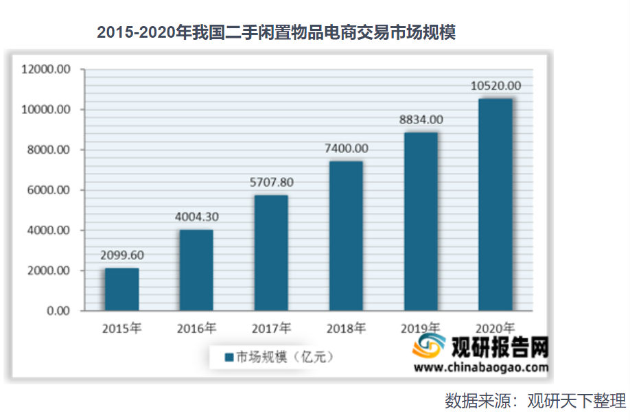 从近年来我国二手电商交易用户规模与交易量的增长情况来看,我国二手电商交易市场正蓬勃发展 ,数据显示,2019年中国二手闲置物品电商交易市场规模达8834亿元,截至2020年我国二手闲置物品交易市场规模已突破10000亿元。