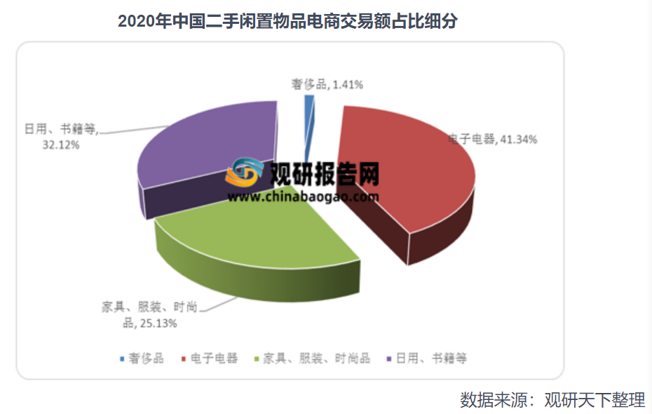 我国二手闲置物品交易电商市场涉及产品种类繁多,涵盖面广,日用品、电器、消费电子、服装、食品等,基本上所有能一手出售的东西,都能在二手闲置物品交易电商市场上进行二手交易。2020年我国电子电器类产品交易金额占比为41.34%;家具、服装及时尚用品交易金额占比为25.13%;日用、书籍及其他品类交易金额占比为32.12%。 其中我国二手闲置物品电商交易市场中交易金额最大的是电子电器类物品,基本快达到二手闲置电商交易额的一半。