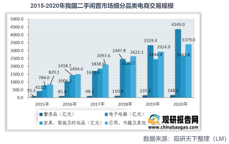 从具体细分商品交易金额看,我国二手奢侈品交易金额从2015年的75.3亿元增长至2020年的148.2亿元,6年来增长量近一倍;二手电子电器交易金额从2015年的411.2亿元增长至2020年的4349.0亿元,增长了10倍不止;二手家具、服装及时尚品交易金额从2015年的784.0亿元增长至2020年的2643.8亿元;二手日用、书籍及其他产品交易金额从2015年的829.1亿元增长至2020年的3379.0亿元。每种商品的交易金额增长率极快速,增长量巨大。