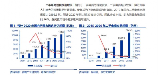 预计2020 年二手电商交易规模将达到 3745.5 亿元,同比增长 44%,用户数量将达 1.82 亿人。