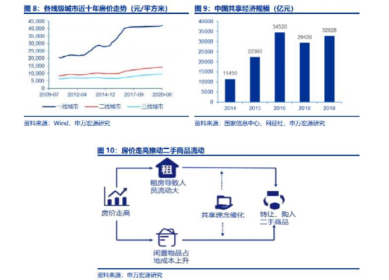 其次,高线城市房价走高,一线城市房价 10 年增长超过 100%,闲置物品占用空间的代价不断上升,租房率提升加大人口流动,共享经济理念普及使人们更倾向于将家中闲置物品出售转让。
