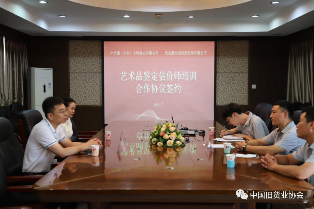 2021年7月27日, 中国旧货业协会文化艺术品委员会秘书长单位<中艺藏(北京)文物鉴定有限公司>与北京潘家园旧货市场有限公司合作正式签约,双方将发挥各自优势,围绕首都文化中心、国际交往中心的功能定位,结合首都文博事业发展的新趋势,采取以培训项目合作落地,逐渐探索新项目合作的方式,在艺术品鉴定培训等领域逐步展开合作。