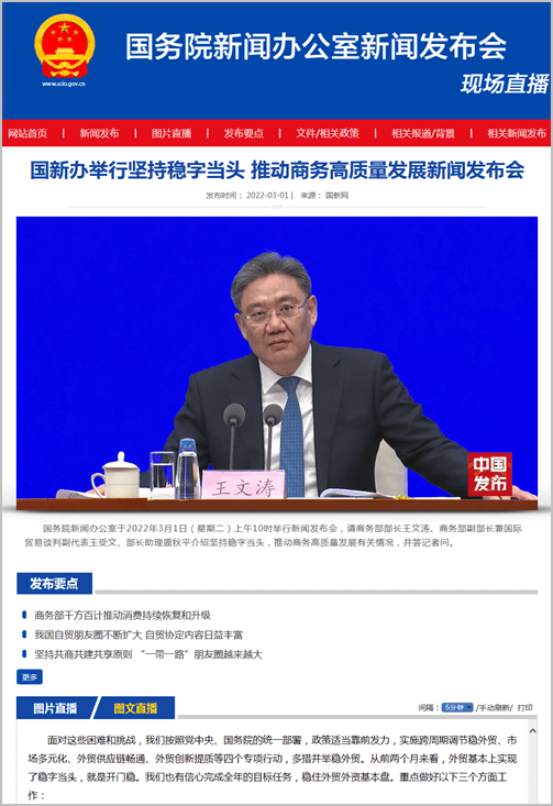 据国新办官网消息,国务院新闻办公室于2022年3月1日举行新闻发布会,商务部部长王文涛、商务部副部长兼国际贸易谈判副代表王受文、部长助理盛秋平介绍坚持稳字当头,推动商务高质量发展有关情况,并答记者问。