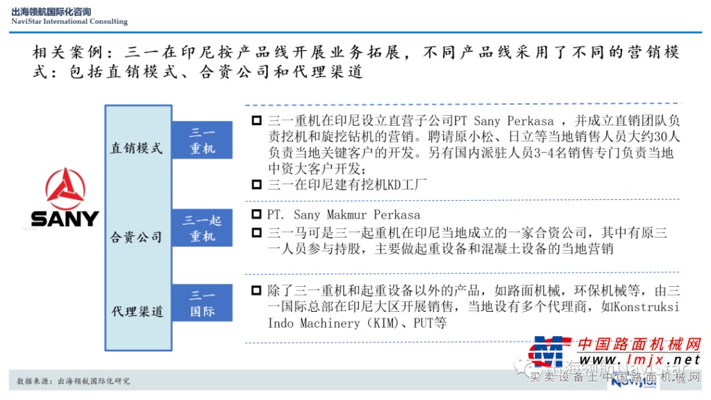 以东南亚区域重点国家印尼为例,三一在印尼按产品线开展业务拓展,不同产品线采用了不同的营销模式:包括直销模式、合资公司和代理渠道。