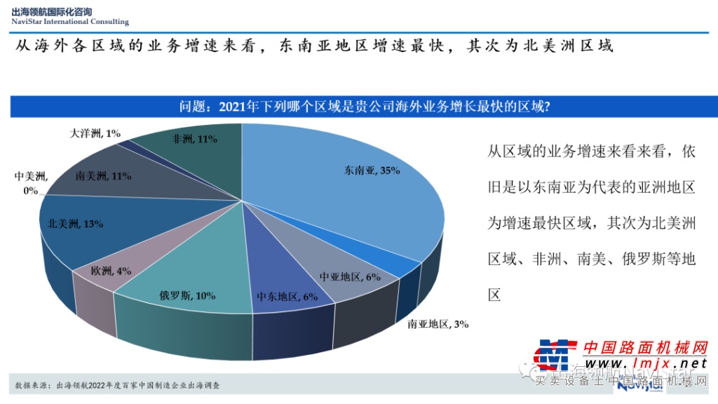 业务收入:《出海领航调查报告》显示,调研企业的2021年海外业务收入,有57%的企业主要市场为亚洲,其中,35%的企业以东南亚为最大海外业务收入来源区域;其次为非洲、北美、中东、南亚、中亚、欧洲等地区。
