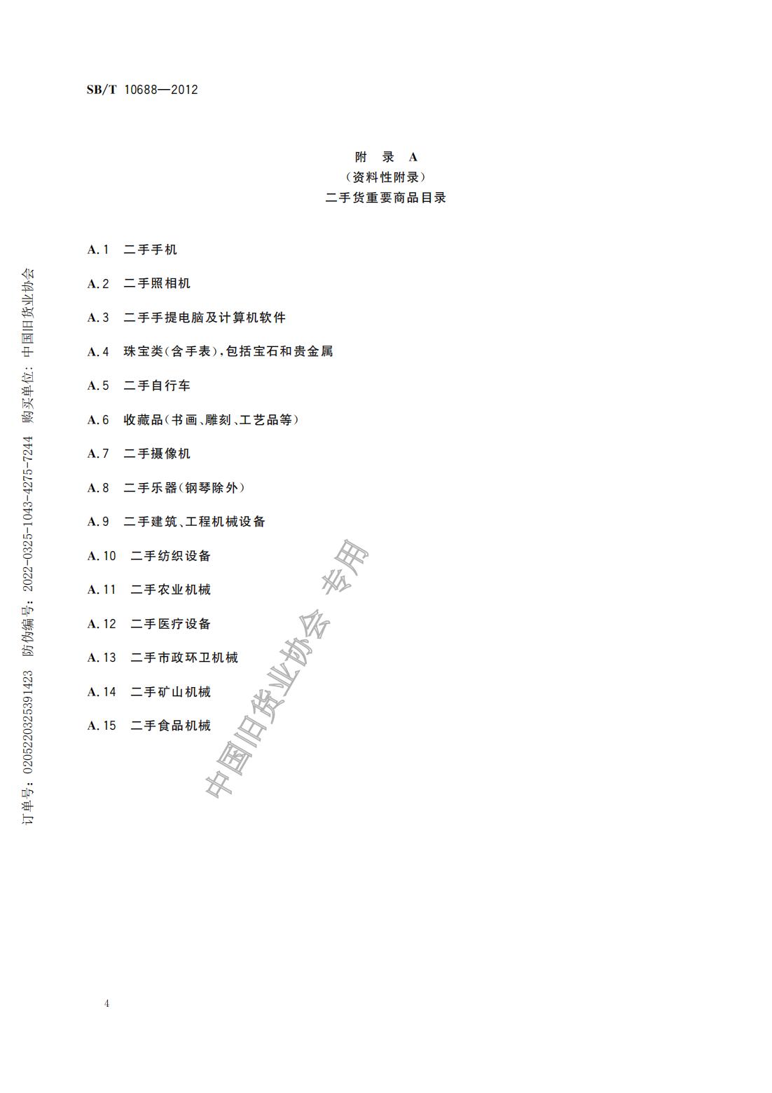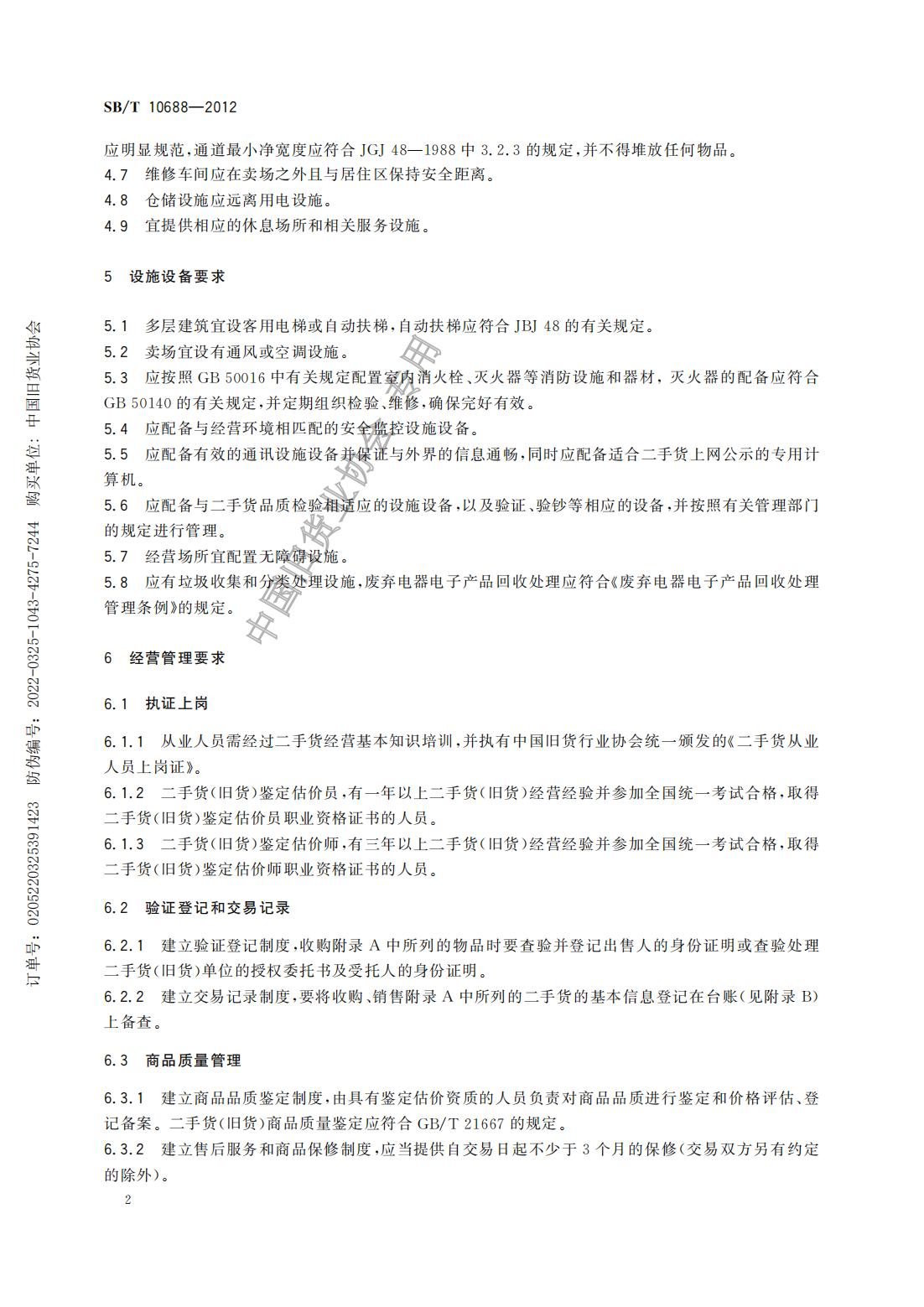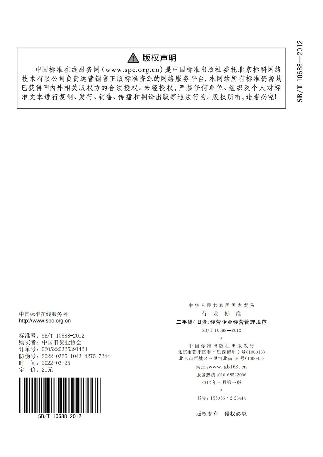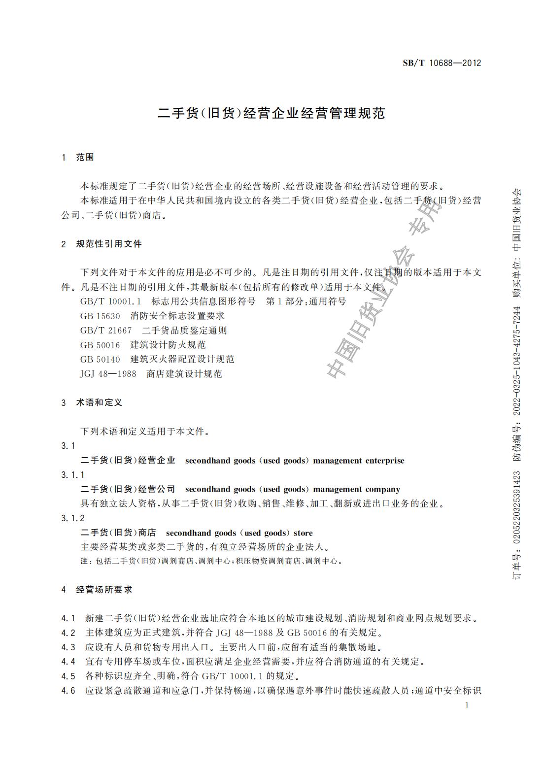 《二手货(旧货)经营企业经营管理规范》SB/T 10688-2012