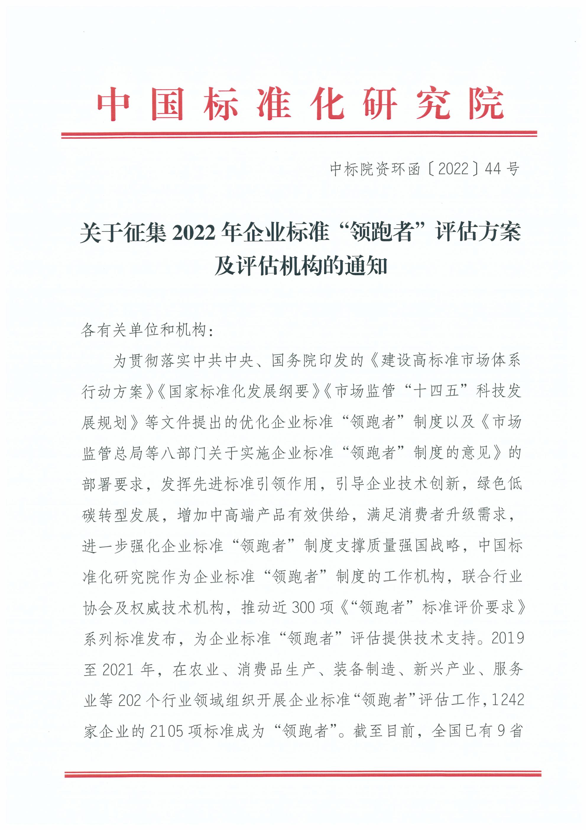 关于征集2022年企业标准“领跑者”评估方案及评估机构的通知