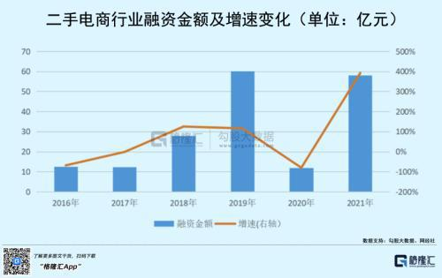 从投融资来看,除去2020年受疫情影响,2019年和2021年中国二手电商平台投融资都呈现增长状态,其中2021年二手电商融资事件数10起,同比上升42.85%;融资总金额58.1亿元,同比去年同期11.8亿元上升392.37%。