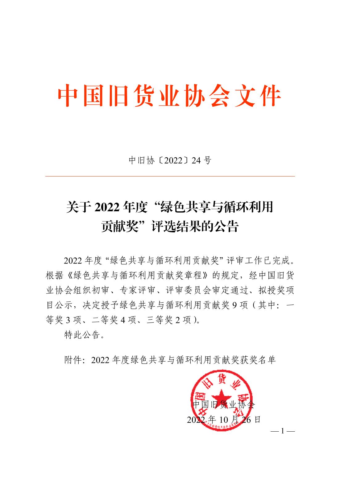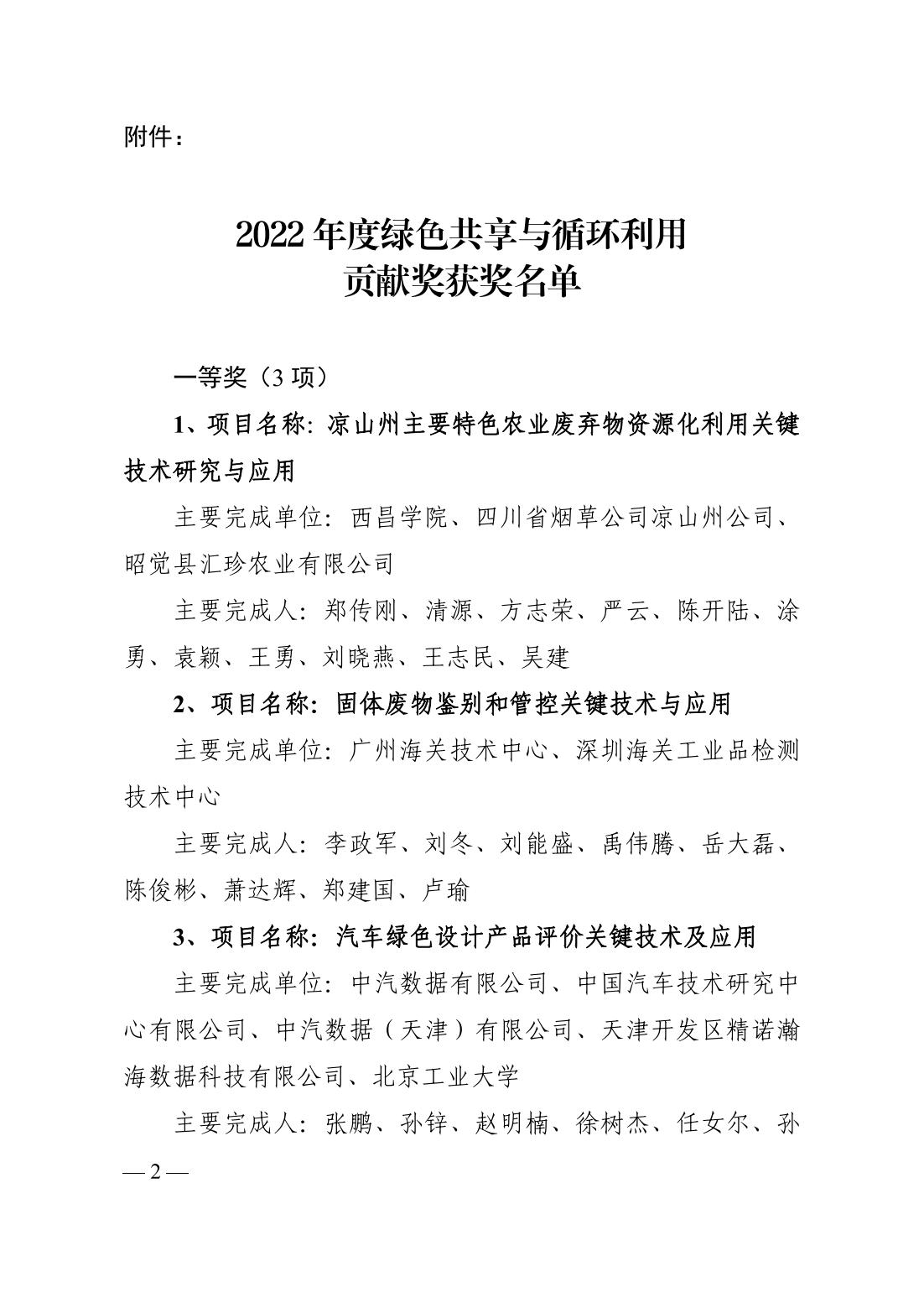 关于2022年度“绿色共享与循环利用贡献奖”评选结果的公告