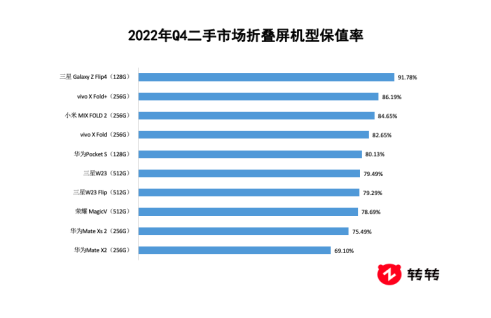二手市场,Q4转转集团手机行情显示,99新折叠屏手机保值率Top10机型中,华为和三星各上榜3款。其中,三星 Galaxy Z Flip4以91.78%的保值率排在第一,vivo X Flod、小米MIX FOLD 2分别以86.19%和84.65%排在第二名和第三名。