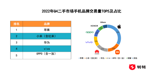 其中,在iPhone14系列新机的拉动下,苹果iPhone的交易量占比稳居第一,且份额回到“3时代”,达到33.34%。小米依旧占据第二,华为与vivo战况胶着,多个季度排位轮番交替。此外,OPPO(含一加)、荣耀、realme、三星和黑鲨稳居第五至九名。环比2022年Q3,仅苹果、华为出现交易量占比上涨。