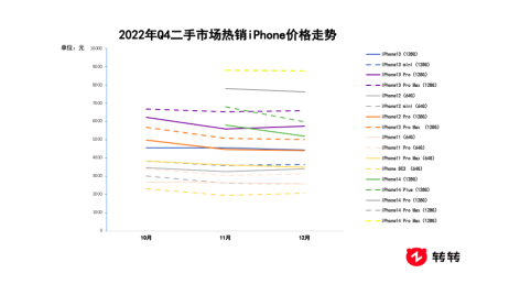 Q4转转集团手机行情显示,二手市场上,iPhone价格普降,iPhone14 Plus在所有iPhone机型中降价幅度最大,12月价格相比11月下滑800元;iPhone14 Pro Max价格最坚挺,同时间段价格仅下调21元。