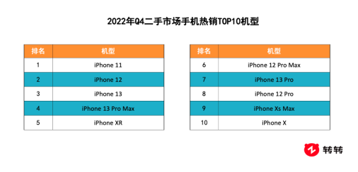 以交易量Top10机型榜单为例,iPhone13 Pro Max的排位从2022年Q3的第6名上至Q4的第四名,iPhone12 Pro Max则从Q3的第九名来到Q4的第六名,iPhone12 Pro新晋上榜。