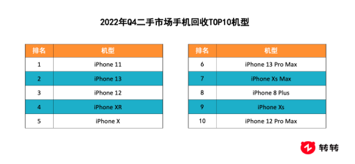 Q4转转集团手机行情显示,iPhone13的回收量还在飞速上涨,从2022年Q1的第12名上升到Q2时的第7名,Q3时已是第3名,到了Q4则排在第2位。