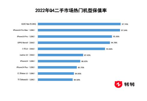 Q4转转集团手机行情显示,iQOO Neo7、iPhone14 Pro Max、iPhone14 Pro三款机型的保值率排在99新热门机型保值率的前三名,保值率分别为97.74%、97.54%、95.36%。
