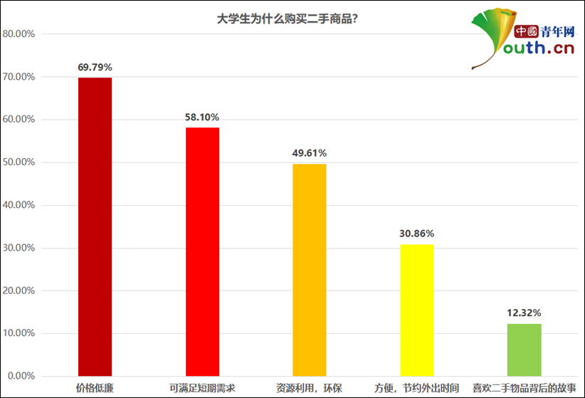 根据中国青年网记者调查显示,72.04%的大学生有闲置物品,80.84%愿意进行闲置物品交易。52.44%的大学生有过购买二手商品的经历。在为何选择购买二手商品问题上,