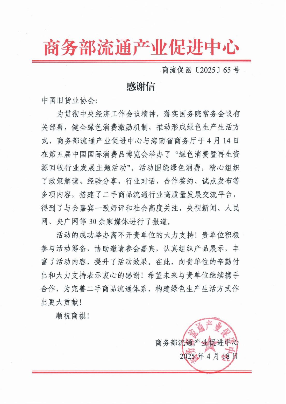 商务部流通产业促进中心发来感谢信
