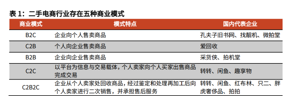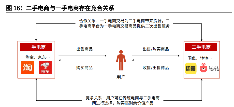 与一手电商相比,二手电商属于存量市场交易。京东、天猫、淘宝等电商平台大 多采用 B2C 或 C2C 的模式,生产商生产产品,随后经一手电商平台供应渠道商 流向消费者,属于增量市场交易;闲鱼、转转等二手电商大多采用 C2C 和 C2B2C 的模式,商品在 C 端用户之间进行流通,属于存量市场交易。二手电商虽然与 一手电商存在一定竞争关系,但二手电商平台大多依存一手电商,受益于一手电 商平台的用户流量,同时二手电商平台作为一手电商的补充业态,填补了用户二 手交易需求的空白,从而进一步完善综合电商平台的生态构建。头部电商和互联 网平台积极布局二手电商业务,阿里巴巴布局闲鱼,京东布局爱回收,58 和腾 讯推出转转。