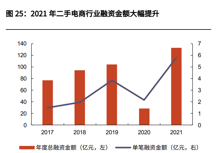从融资金额维度看,根据 IT 桔子 数据,2017-2019 年中国二手电商行业融资金额从 76.52 亿元增长到 103.84 亿 元,CAGR=16.5%;截至 2021 年 9 月 27 日,2021 年二手电商行业融资金额为 132.66 亿元。从单笔融资金额维度看,根据 IT 桔子数据,单笔融资金额从 2017 年的 1.5 亿元增加至 2019 年 3.8 亿元,2021.1-9月单笔融资金额为 5.8 亿元。 单笔融资金额整体呈现上升趋势,说明二手电商平台后轮融资加快,行业发展逐 步成熟。