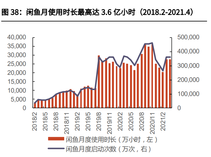 根据易观千帆统计数据,从 MAU 来看,闲鱼月度 活跃用户数从 2018 年 2 月 1,603.29 万人提升至 2021 年 4 月 12,448.13 万人, 2020 年平均月度活跃用户数为 9,331.02 万人次,同比增长 88%。从月度使用 时长来看,2020 年闲鱼平均月度使用时长为 2.75 亿小时,同比增长 55.75%, 较 2018 年 2 月的 0.31 亿小时提升约 8 倍,2021 年月度使用时长维持在 2 亿小 时以上。从 APP 启动次数来看,2020 年总启动次数为 444.26 亿次,同比增长 68.76%。