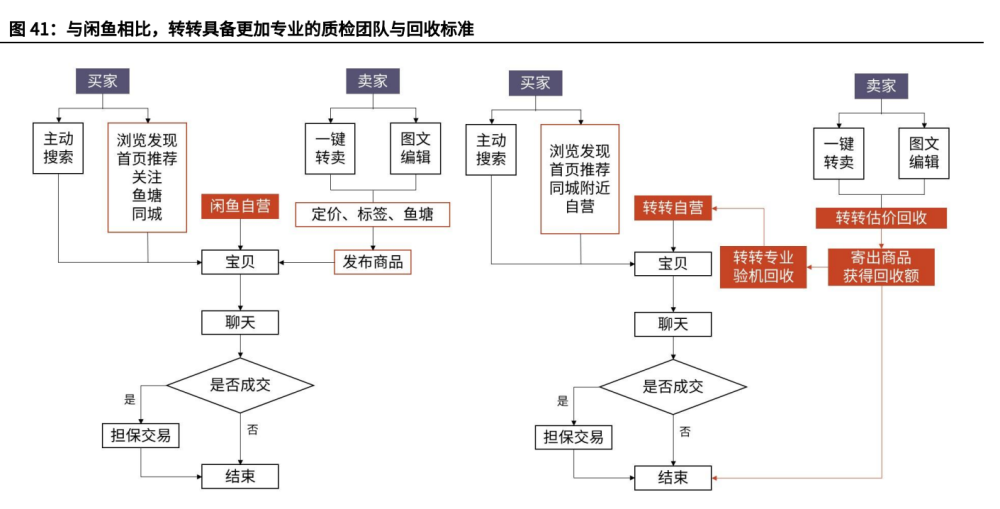 闲鱼和转转的主要区别:1)产品定位不同。闲鱼是全品类二手交易社区,种类 丰富,用户量大;转转聚焦二手 3C,有自己专属的专业团队以及评判标准。2) 交易模式不同。闲鱼专注 C2C 社区化交易模式,营造了良好的社交圈,并且通 过对接淘宝“一键转卖”,平台具有丰富的 SKU;转转由 C2C 向 C2B2C 模式 转换,目前两种交易模式并存,二手 3C 领域更具专业优势。3)盈利模式不同。 闲鱼资金对接支付宝,相较于转转增加了部分现金收益。