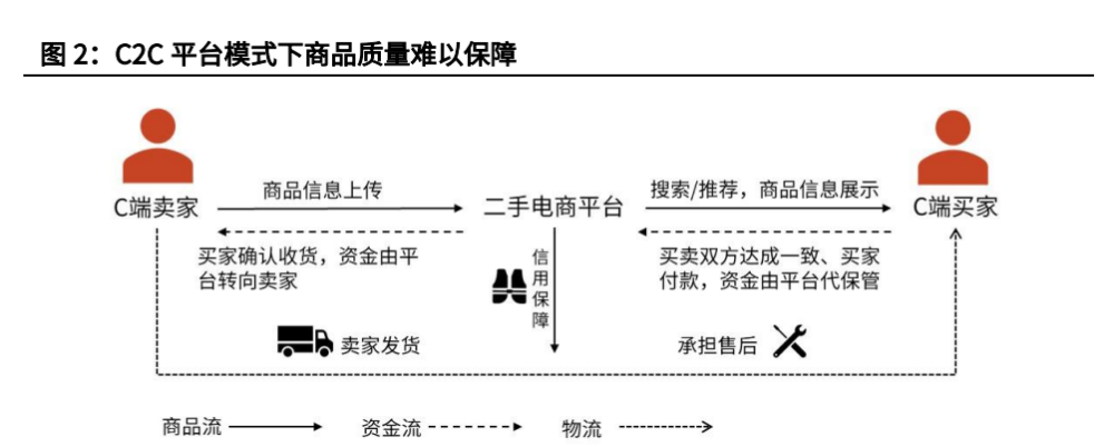 C2C 模式下,二手电商是为买卖双方提供商品交易和信用保障的平台,平台属 于轻资产模式,比较适用于非标产品的转让。C 端卖家在平台上发布商品信息, 平台负责宣传、撮合买卖双方的交易。买卖双方关于商品价格、品质、售后等达 成一致后,C 端买家向平台支付货款,卖家自行邮寄商品,商品款项由平台代为 保管;买家确认收货后,商品货款由平台转向卖家,平台在此过程中收取佣金或 手续费。C2C 模式中,买卖双方直接进行协商交易,交易相对灵活;虽然平台对 买卖双方交易过程提供一定的信用保障,但商品质量保障仍由卖家负责,因此存 在一定程度的信用问题,C2C 平台往往强调社交属性,通过强化买卖双方的沟通 交流降低消费者的不信任感,通常适用于小众商品、服饰及书籍等非标产品的买 卖。