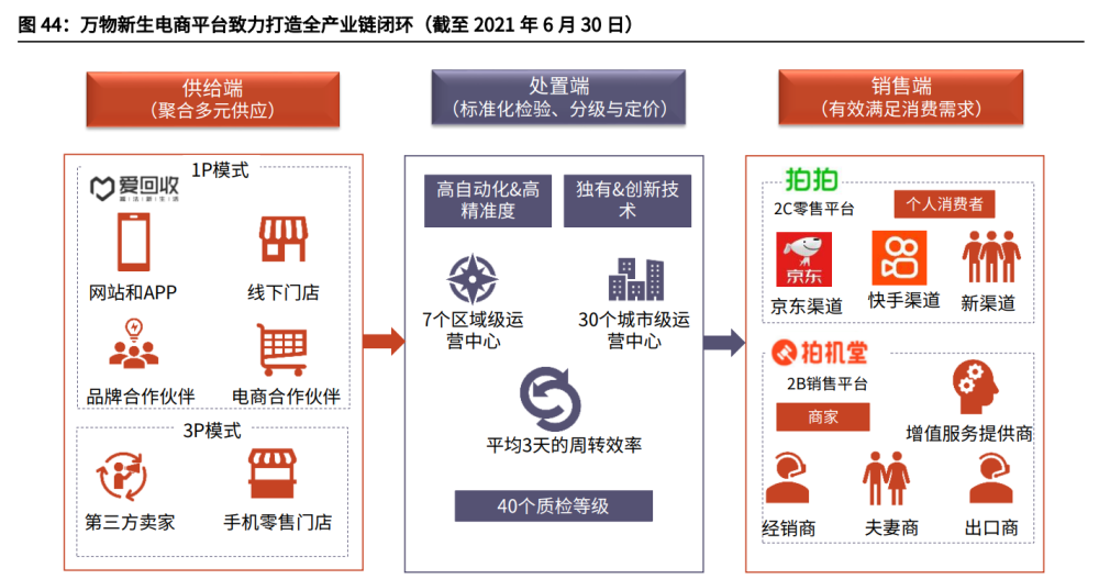 四大业务线聚焦二手 3C 市场,致力打造全产业链闭环。公司深耕二手消费电子 行业近十年,首创行业检测、分级和定价流程,已发展成为覆盖产业链供需两端 的多业务平台。1)供给端:通过爱回收线上和线下门店、与京东、快手合作、 手机零售门店等多个渠道提供稳定的二手 3C 产品货源。2)处置端:产品回收 后经过公司高自动化、高精准度的质检服务,对产品进行标准化的检验、分级与 定价。3)销售端:通过拍拍和拍机堂将产品分别销售给个人消费者和商家。爱 回收、拍拍、拍机堂三个业务平台实现了公司 C2B、B2B、B2C 多种业务模式全 覆盖,使供给端、消费端标准化和规模化。除了线上平台,万物新生也致力于打 造线下业态,截至 2021 年 6 月 30 日,集团在中国 184 个城市开拓 862 家门店 (850 家为爱回收门店,12 家为拍拍门店)及 1500 多个自助服务站。