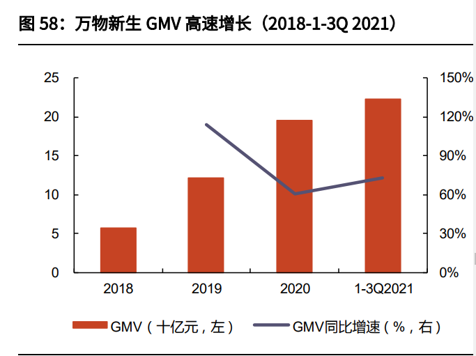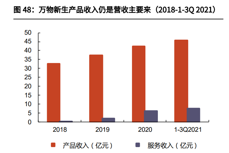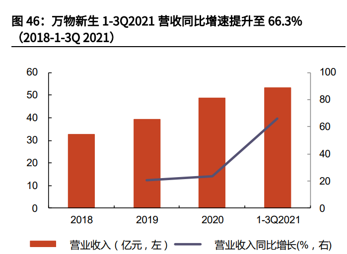 高毛利率服务收入占比提高,产品收入仍是营收主要来源。按收入结构来看,万 物新生营业收入主要由产品收入、服务收入两个板块构成。其中,产品收入为其 主要收入来源,2018-2020 年产品收入分别为 32.50/37.30/42.44 亿元,占比分 别为 99.6%/94.9%/87.4%。随着公司消费产品交易数量的增长,1-3Q2021 产 品收入达 45.79 亿元,同比增速 63.4%。服务收入来源于公司对在线平台商家 和用户收取的佣金。平台货币化率从 2018 年的 0.5%提升至 2019 年的 2.4%, 于 2020 年达到 4.1%,带动万物新生服务收入占比逐步提升,2018-2020 年分 别实现服务收入 0.12/2.02/6.14 亿元,同期 CAGR=615.3%。1-3Q2021 服务收 入 7.66 亿元,占营收比重提升至 14.3%。