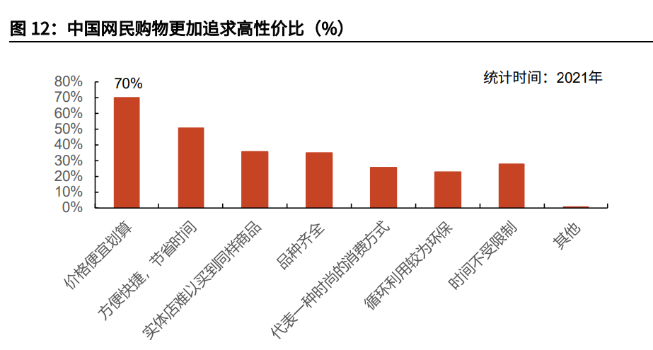 从消费需求角度看,二手电商满足了消费者追求高性价比的消费需求:用可接受 的商品缺陷换取预期内的价格折扣,更注重商品的功能属性和性价比等特征。据 艾媒咨询 2021 年 5 月的调查数据,中国 70.4%网民在二手电商平台购物是因为 商品价格便宜。其他原因包括:方便快捷(50.7%)、实体店难以买到同样的商品 (35.4%)、品种齐全(35.0%)、代表一种时尚的消费方式(25.7%)等。