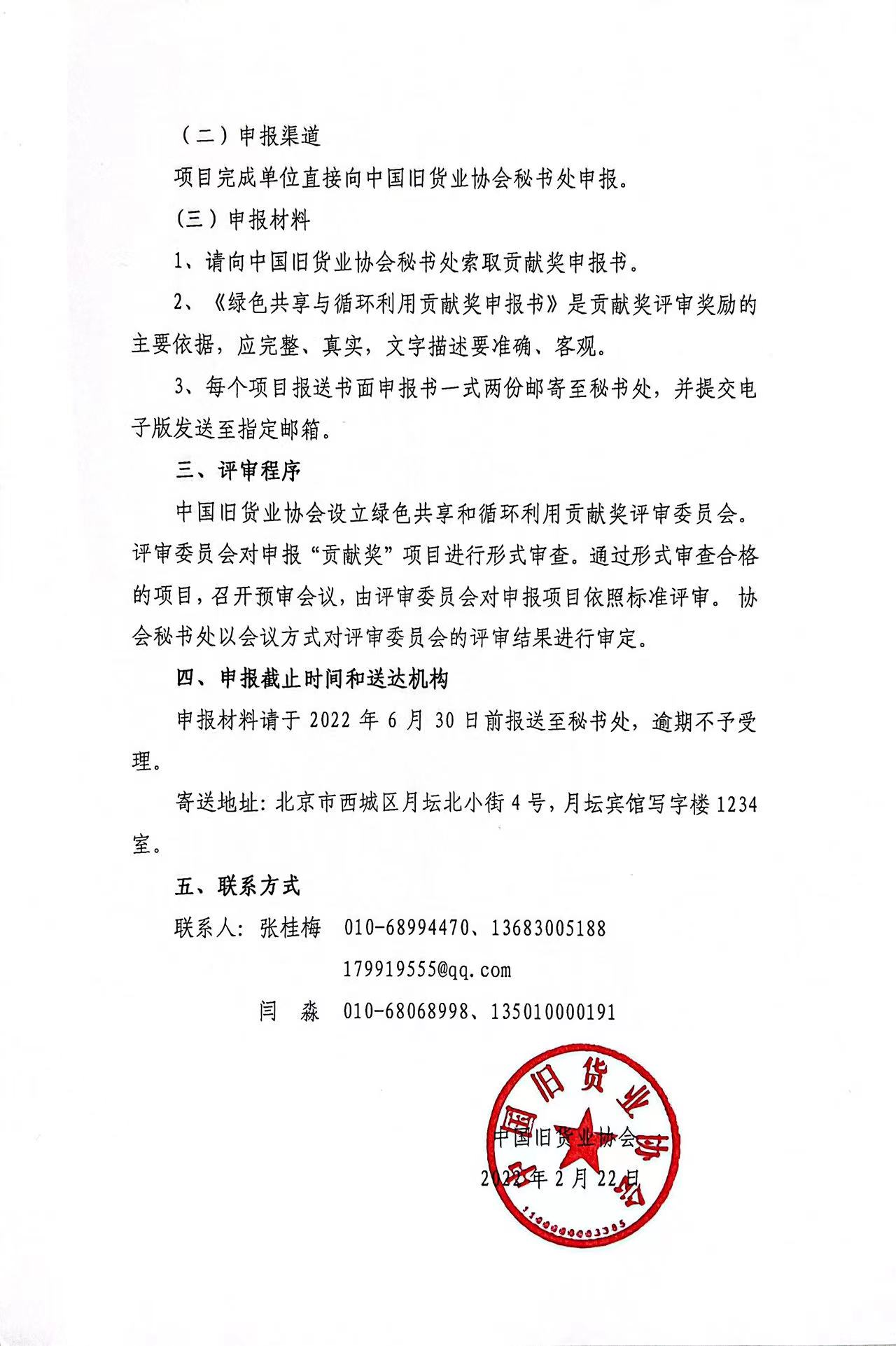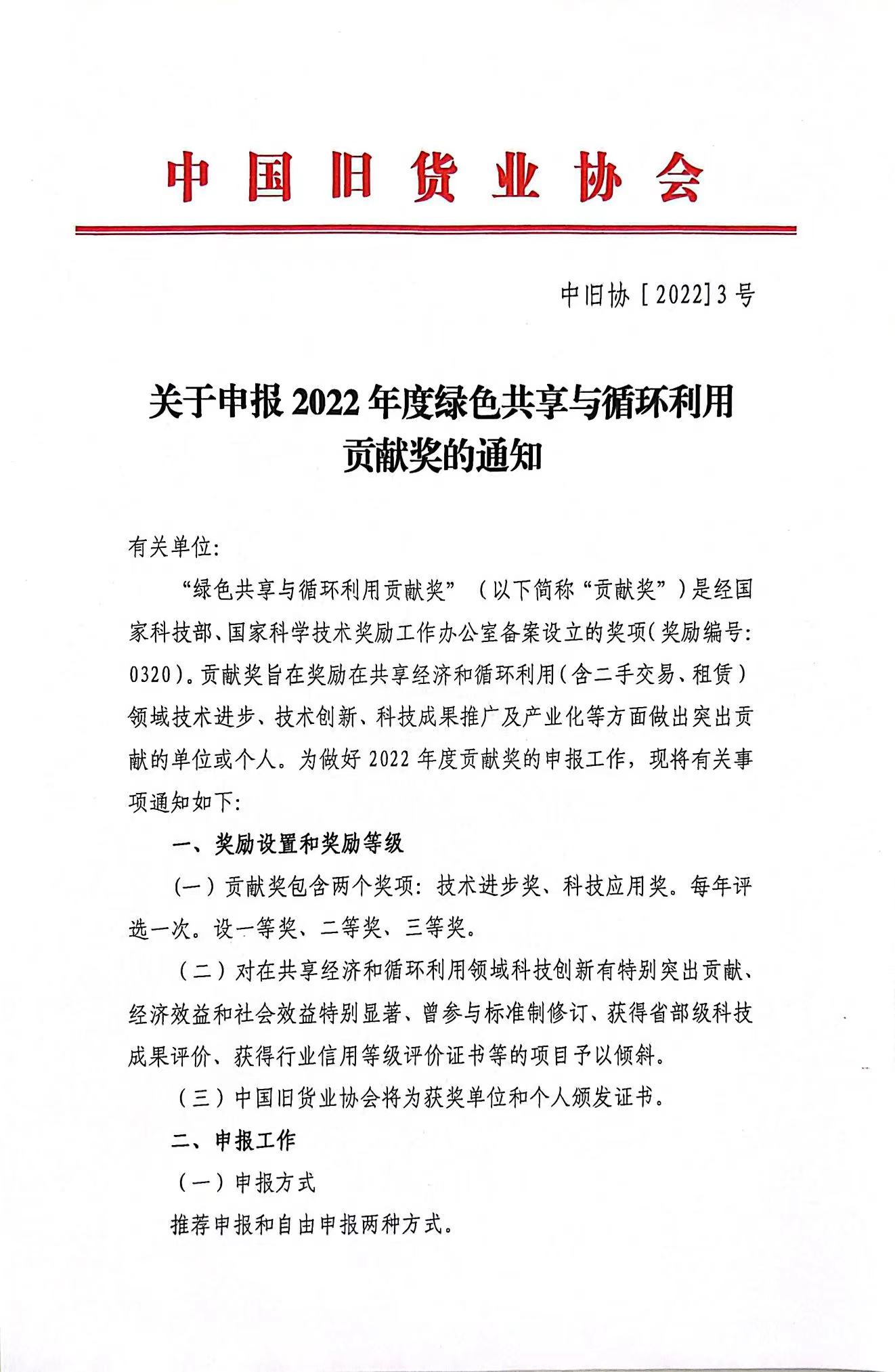 关于申报2022年度绿色共享与循环利用 贡献奖的通知