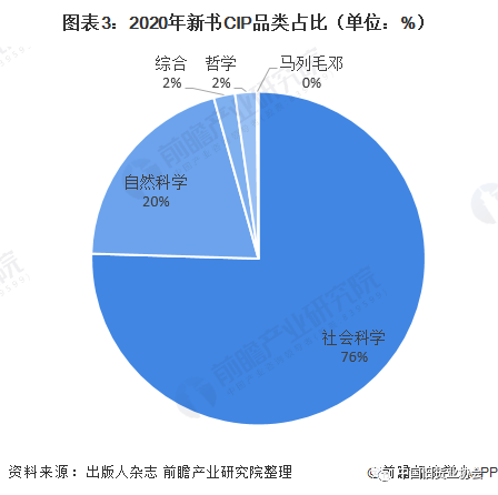 从新书品类来看,2020年,社科类图书占比最高,申请书号总量占比为75.4%,其次为自然科学类图书,占比20.2%;除综合图书总量同比增加37.38%外,各品类新书CIP总量同比均有所减少。