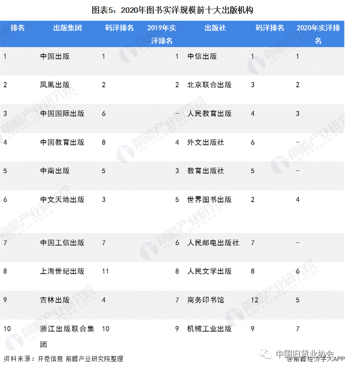 北京开卷数据显示,2020年出版公司实洋排名来看中中国出版、凤凰传媒出版和中国国际出版位列前三位,其中中国国际出版集团为2020年新入榜,其余前十大出版集团排名较2019年仅小幅变化,上市出版集团中中南传媒、中文传媒实洋排名小幅下滑2位和1位排名第五和第六位;单体出版社中中信出版、北京联合出版、人民教育出版实洋排名继续保持前三位,外文出版社、教育出版社及人民邮电出版社为2020年新入榜。
