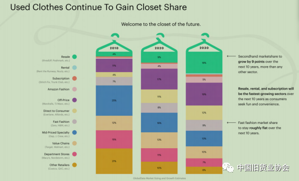 图4:2010年-2030衣橱中各类型衣服占比变化(数据来源:ThredUp 2021转售报告)
